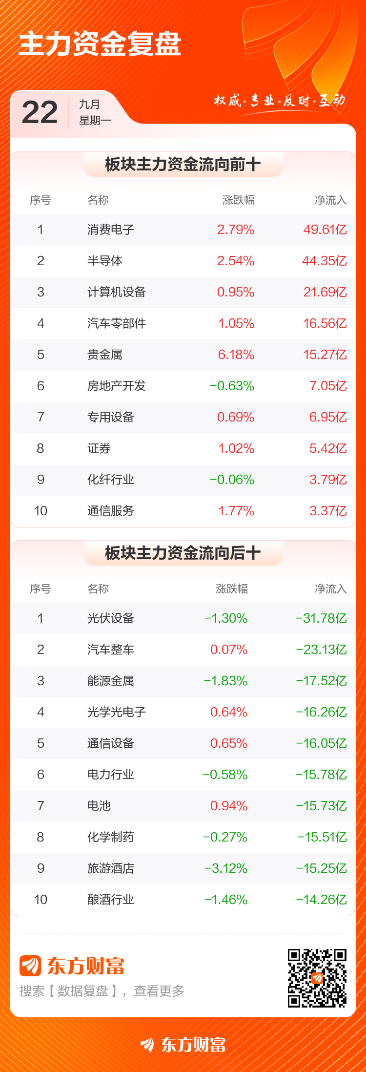 9月22日,A股市场表现活跃,沪指涨0.22%,深成指涨0.67%,创业板指涨0.55%,股市热点持续发酵。两市成交额达2.12万亿,较上个交易日缩量2023亿,显示出市场资金的谨慎态度。数据显示,今日大盘主力资金净流出251.70亿,但消费电子、半导体、计算机设备等板块主力资金流入排名居前,其中消费电子净流入49.61亿元,成为资金追捧的热点板块。