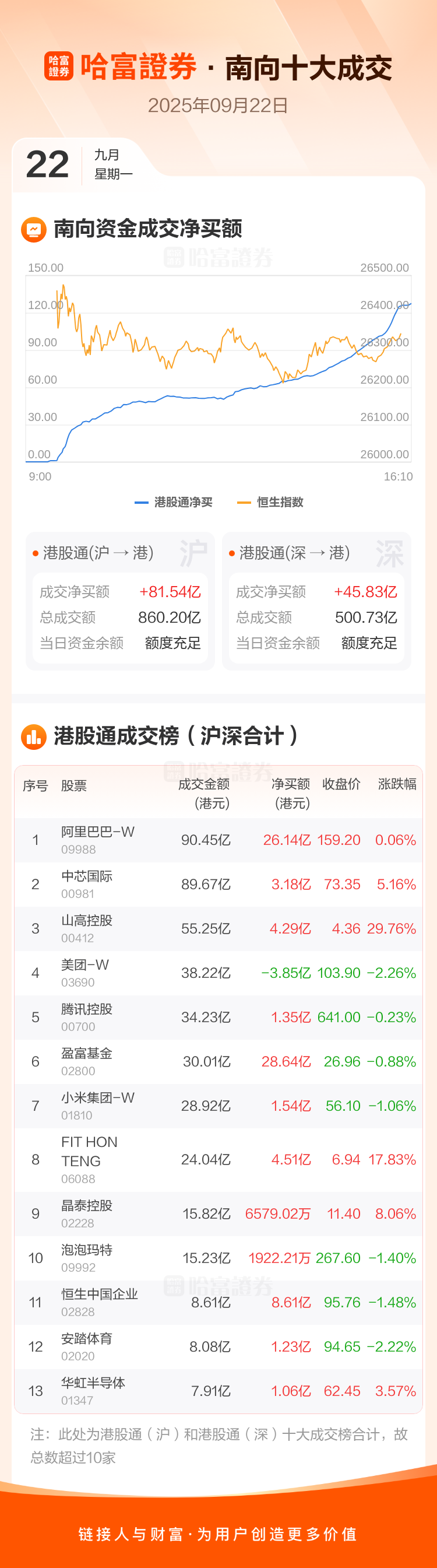 9月22日恒生指数跌0.76%,南向资金净买入港股127.36亿港元,成交额1360.93亿港元。十大成交股中盈富基金等获净买入,美团-W遭净卖出。