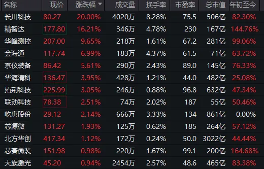 半导体设备概念股大面积高开,长川科技20%涨停,精智达、华峰测控、金海通等跟涨,显示出半导体行业的强劲势头。消息面上,长川科技发布2025年前三季度业绩预告,预计归属于上市公司股东的净利润为8.27亿元至8.77亿元,同比增长131.39%至145.38%,业绩增长显著。
