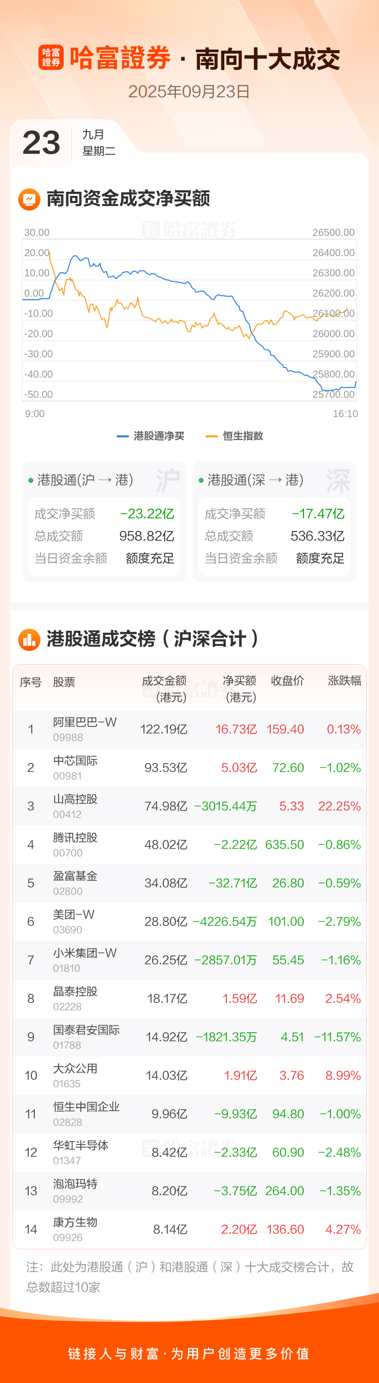 9月23日恒生指数跌0.7%,南向资金净卖出港股40.69亿港元。南向资金成交额1495.15亿港元,港股大市成交2945.61亿港元。南向十大成交股中,部分获净买入,部分遭净卖出。