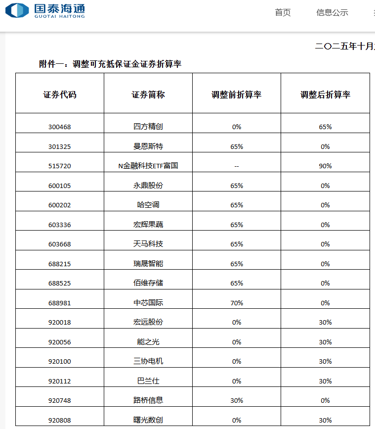 记者查询国泰海通证券官网信息显示,10月9日共有9只股票的可冲抵保证金折算率调整为零。具体来看,曼恩斯特(301325)、永鼎股份(600105)、哈空调(600202)、宏辉果蔬(603336)、天马科技(603668)、瑞晟智能(688215)、佰维存储(688525)的折算率,均由65%调整为0%。中芯国际(688981)的折算率则由70%调整为0%。路桥信息(920748)的折算率,则由30%调整为0%。