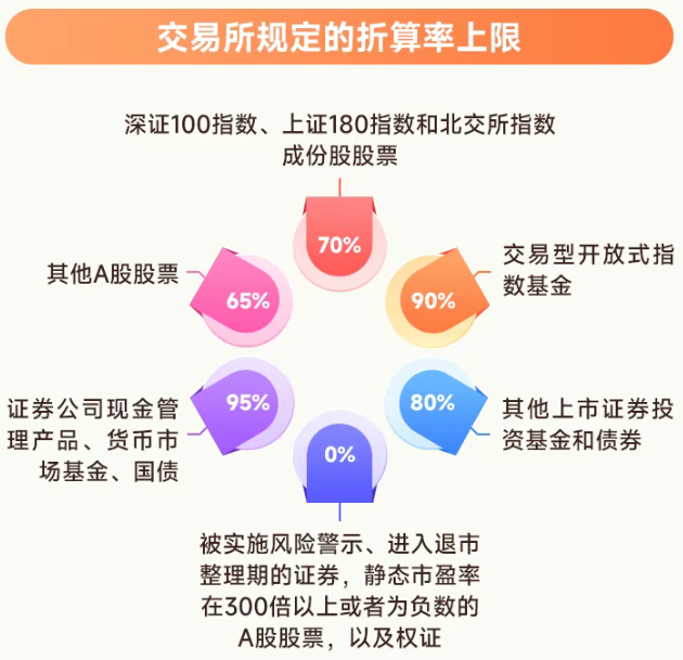 通俗而言,国信证券举例称:假设证券A在公布的可充抵保证金证券名单内,折算率为65%。投资者开立信用账户后转入了100万元现金和100万元市值的证券A,那么此时投资者信用账户的保证金金额=100万元(现金)*100%+100万元(证券A)*65%=165万元。据悉,2016年12月2日,沪深交易所发布联合公告,经证监会批准,两家交易所对《融资融券交易实施细则》进行了修订,调整可充抵保证金证券折算率要求,将静态市盈率在300倍以上或者为负数的股票折算率下调为0%。2023年修订的《融资融券交易实施细则》第三十六条指出,可充抵保证金的证券,在计算保证金金额时应当以证券市值或净值按下列折算率进行折算。一是上证180指数成份股股票的折算率最高不超过70%,其他A股股票折算率最高不超过65%;二是交易型开放式指数基金折算率最高不超过90%;三是证券公司现金管理产品、货币市场基金、国债折算率最高不超过95%;四是被实施风险警示、进入退市整理期的证券,静态市盈率在300倍以上或者为负数的A股股票,以及权证的折算率为0%;五是其他上市证券投资基金和债券折算率最高不超过80%。