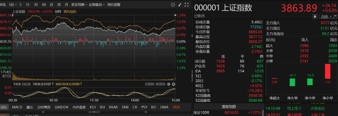 10月20日,A股三大指数集体上涨,市场迎来久违的回暖行情。截至收盘,沪指涨0.63%,深证成指涨0.98%,创业板指涨1.98%,科技股与资源股双双走强,成为当日核心亮点。沪深两市成交额1.74万亿元,较上一交易日缩量约2000亿元,但个股表现活跃,上涨股票数量接近4100只。煤炭行业、燃气、非金属材料、电机、航空机场、通信服务、电池、通信设备、消费电子板块涨幅居前,贵金属板块“逆市”重挫。