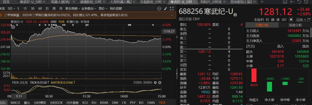 科技板块今日表现尤为亮眼,寒武纪三季报业绩堪称“王炸”,直接带动芯片半导体及CPO概念股集体大涨。根据三季报,寒武纪2025年1-9月实现营业总收入46.07亿元,同比增长2386.38%;归母净利润16.05亿元,同比大幅改善。其中,第三季度单季营收17.27亿元,同比增长1332.52%,归母净利润5.67亿元。卖方研究机构点评称,寒武纪作为国内AI芯片龙头,存货持续增加至37亿元,较上季度末增加约10亿元,显示出产业链供应韧性较强。东吴证券更上调其2025-2027年营收预测至67.71亿元、135.35亿元和230.04亿元,归母净利润至21.06亿元、48.69亿元和87.33亿元,维持“买入”评级。受此影响,寒武纪早盘最大涨幅近7%,股价一度重返1300元关口,同时带动CPO概念股汇绿生态、剑桥科技涨停,天孚通信、仕佳光子等涨幅靠前。