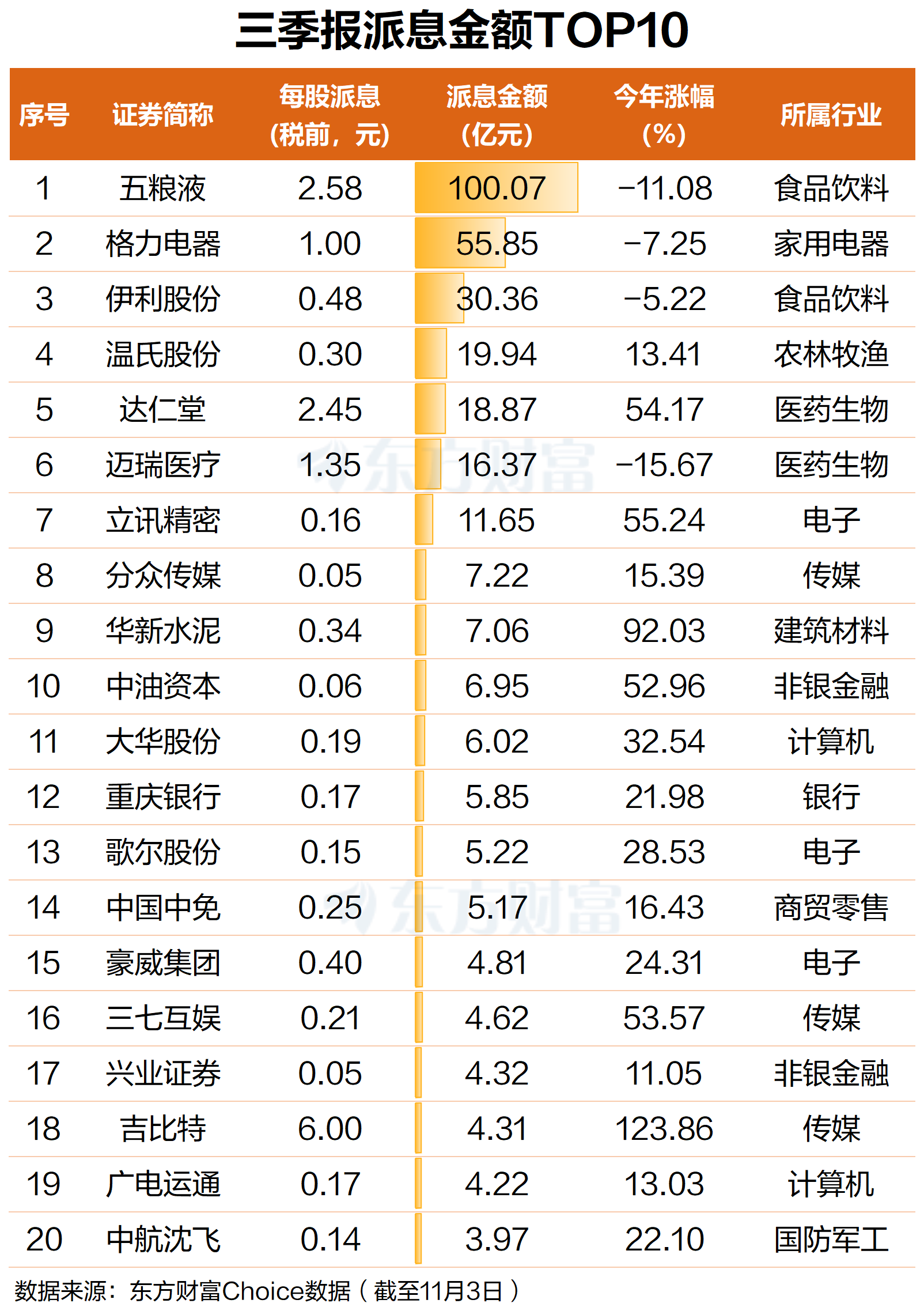 五粮液、格力电器、伊利股份和温氏股份这4家行业龙头,三季报派息金额合计206.22亿元,占全市场三季报分红总额的44%。除上述公司外,医药生物行业的达仁堂和迈瑞医疗,以及电子行业龙头立讯精密,派现金额均超10亿元。分析人士认为,强化分红政策有助于培育价值投资理念,减少市场投机行为,从而促进资本市场的稳定健康发展。