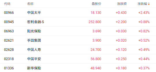 截至收盘,中国太平(00966.HK)涨2.43%、中国人寿(02628.HK)涨0.49%、中国平安(02318.HK)涨0.44%。