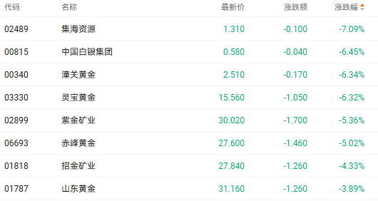 截至收盘,潼关黄金(00340.HK)跌6.34%、灵宝黄金(03330.HK)跌6.32%、紫金矿业(02899.HK)跌5.36%。