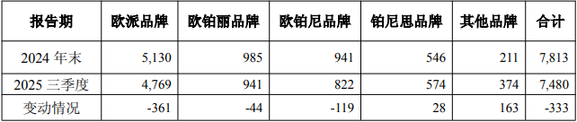 欧派家居2025年前三季度主要经营数据显示,截至报告期内,欧派共拥有7480家门店,其中欧派品牌4769家,欧铂丽品牌941家,欧铂尼品牌822家,铂尼思品牌574家,整体门店数量相较2024年末减少333家。期内,欧派家居经销店收入为99.34亿元,同比下滑4.42%。
