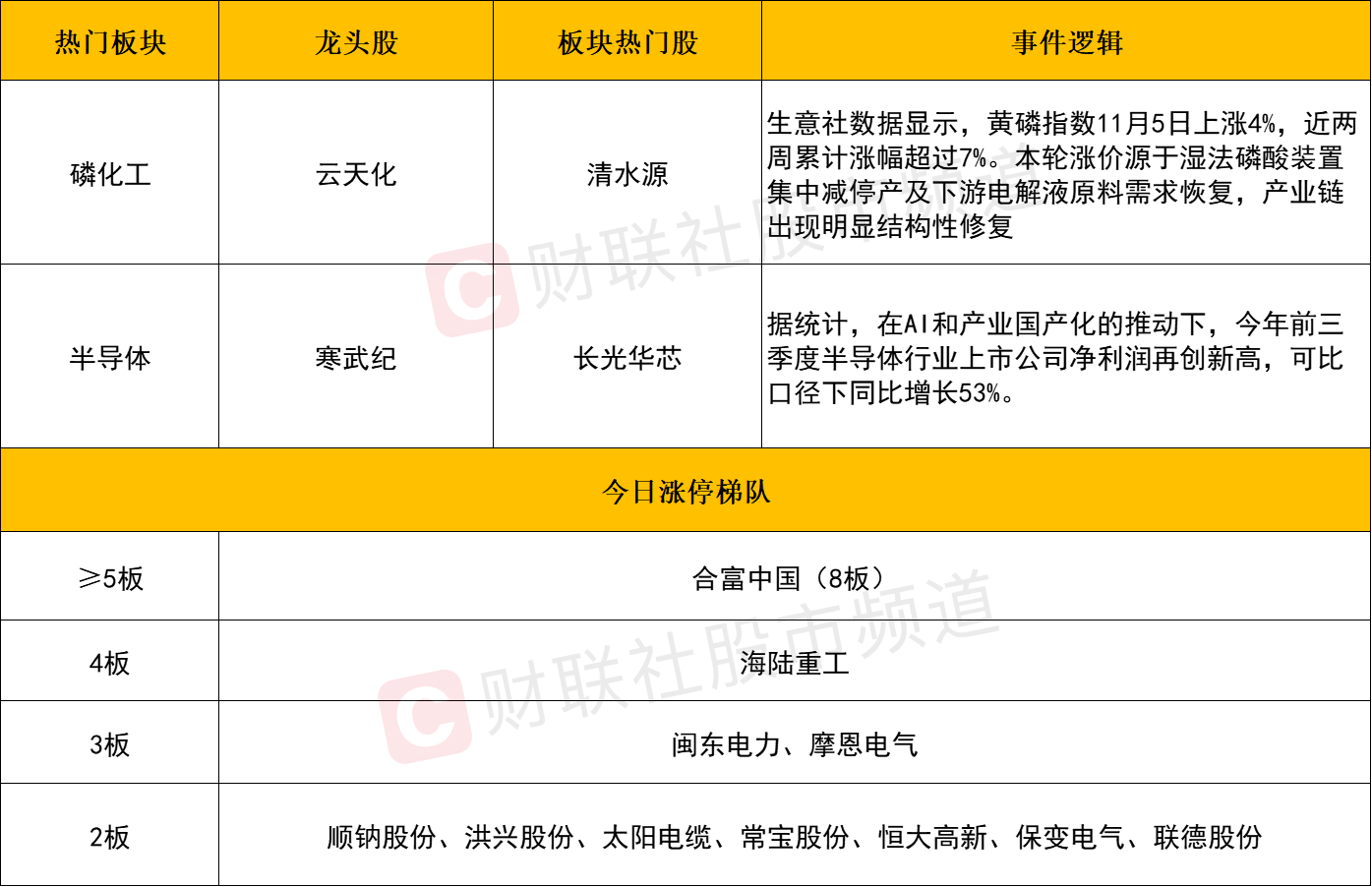 磷化工板块同样涨幅居前,清水源、澄星股份、芭田股份、云天化涨停,六国化工、湖北宜化、兴发集团涨幅居前。生意社数据显示,黄磷指数11月5日上涨4%,近两周累计涨幅超过7%,本轮涨价源于湿法磷酸装置集中减停产及下游电解液原料需求恢复。此外,多家化工上市公司今年前三季度业绩翻倍增长,上海申银万国证券认为,磷化工是今年三季度净利润同比增幅较大、环比提升较大的子行业。