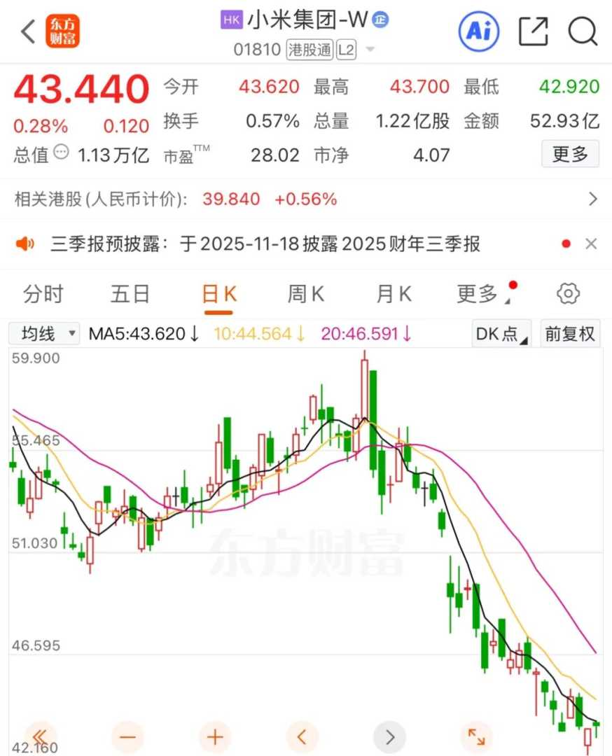 据《彭博》报道,高盛表示,对冲基金已对小米股票转为看空(小米投资),并可能将空头仓位维持至财报季。该报告称,养老金和对冲基金的抛售在过去两周加剧,反馈表明小米“由于缺乏催化剂,至少在短期内是共识做空/卖出”。自今年6月创下历史高位之后,小米股价开始转跌,至今跌幅已近30%(小米股价)。但中信证券最新的研报认为,小米2025年三季度将实现整体收入1132亿元,同比增长22.3%;Non-IFRS净利润102亿元,同比增长63%,净利润率9%。中信看好小米持续成为中国乃至全球最优秀的硬核科技生态公司(小米科技)。
