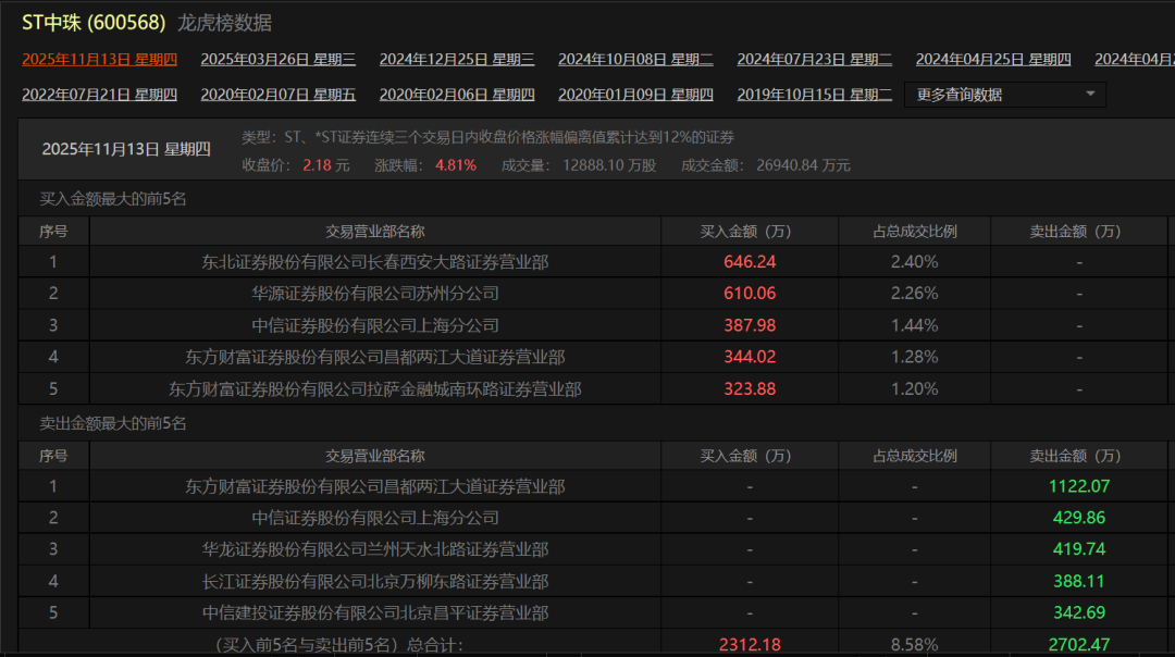 11月13日,ST中珠登上龙虎榜,前五大买方、卖方席位均为券商营业部,包括东方财富证券股份有限公司昌都两江大道证券营业部、东方财富证券股份有限公司拉萨金融城南环路证券营业部等。