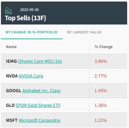 截至季末,桥水前十大持仓的集中度为32.54%,iShares核心标普500ETF(IVV)与SPDR标普500ETF(SPY)仍然位居前二。原本排在第三大持仓的英伟达跌至第六。数据显示,桥水三季度减持了近472万股,这也让英伟达登上了桥水的“Top Sells”榜单。截至三季度末,桥水持有251万股英伟达,数量相较于二季度末的723万股降低65.3%。