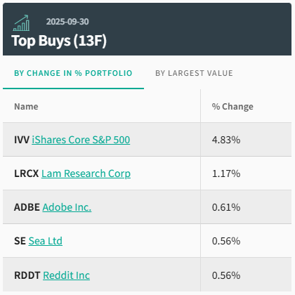 桥水三季度“Top Buys”前五分别为iShares核心标普500ETF(IVV)、芯片股泛林集团(LRCX)、Adobe、“东南亚小腾讯”Sea和“美版贴吧”Reddit。