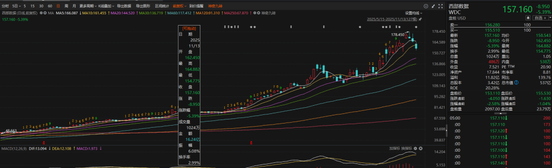 周四东京交易时段,铠侠控股股价仅下跌1.62%,但其美股ADR暴跌引发美股存储板块连锁反应。11月13日,西部数据跌5.39%、希捷科技跌7.31%、美光科技跌3.25%。