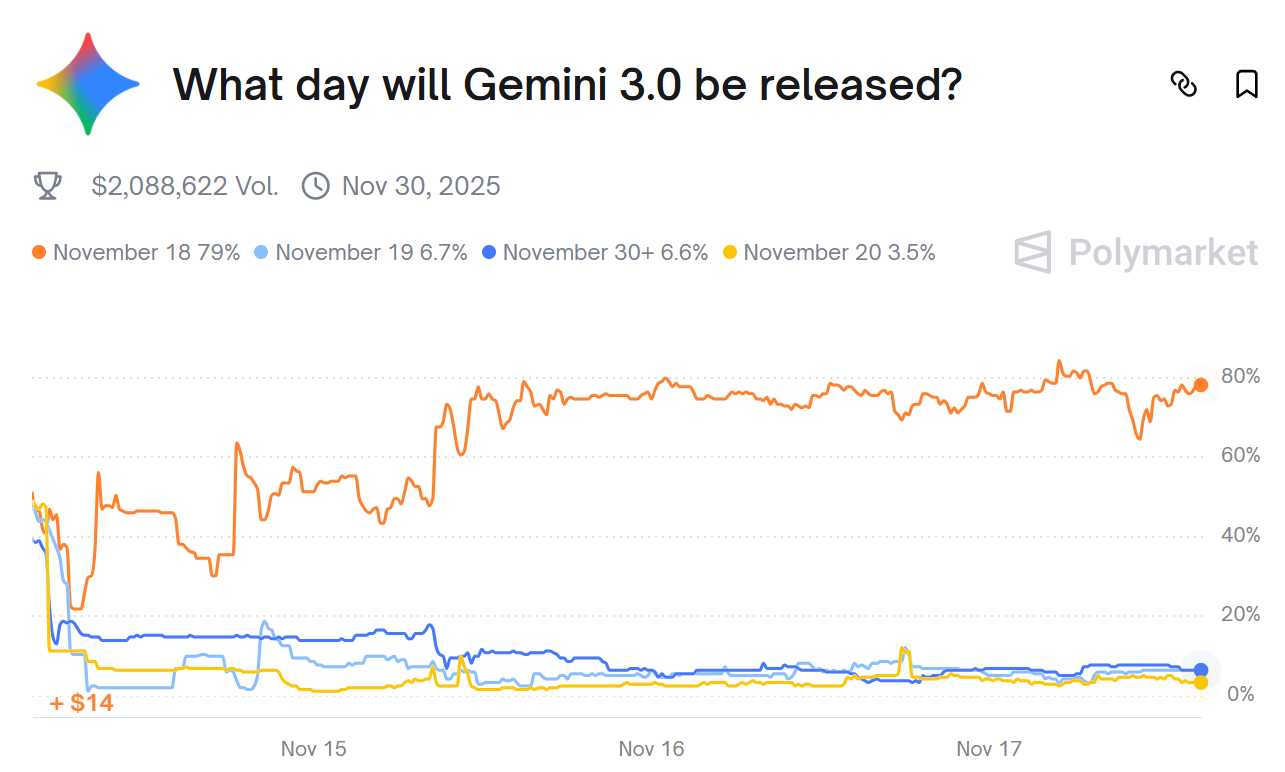 截至发稿,全球最大预测市场Polymarket数据显示,近9成参与者预测备受关注的谷歌Gemini 3.0大模型将于本周发布。甚至在具体发布日期方面,有接近79%的市场参与者下注11月18日。