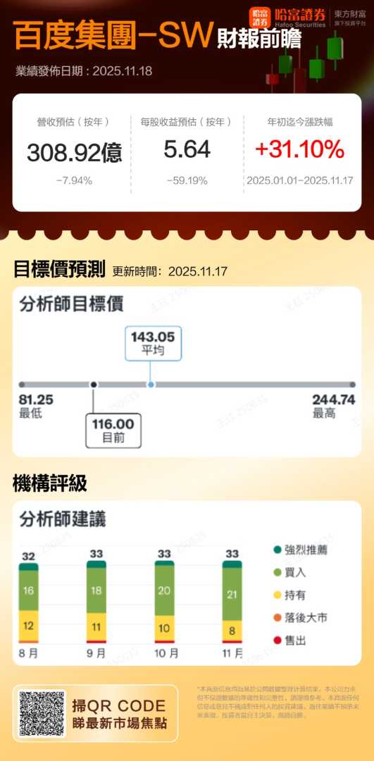 2025年10月至11月,主流券商对百度集团-SW的评级与目标价呈现高度乐观共识: