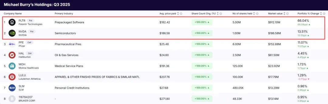 在此背景下,众多知名投资者及机构纷纷出手减持英伟达。本月初,华尔街知名“空头”迈克尔·伯里披露了对英伟达的大量空头头寸,迈克尔·伯里旗下对冲基金Scion Asset Management披露的第三季度持仓报告显示,该基金持有价值约9.12亿美元的500万股Palantir看跌期权和价值约1.87亿美元的100万股英伟达看跌期权(占其资产总值的80%)。
