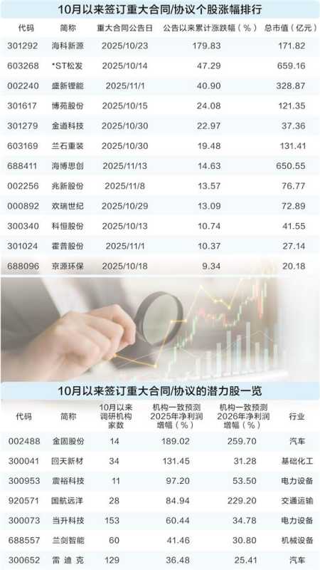 四季度以来,A股近70家公司签订重大合同或战略合作协议,涉及多个行业。这些公司在发布公告后,股价整体表现优于市场,平均涨幅显著。其中,机械设备、电力设备等行业公司数量居前。部分公司股价涨幅惊人,如海科新源累计涨幅近180%。同时,20家公司获机构调研,部分公司净利润增幅预测乐观。