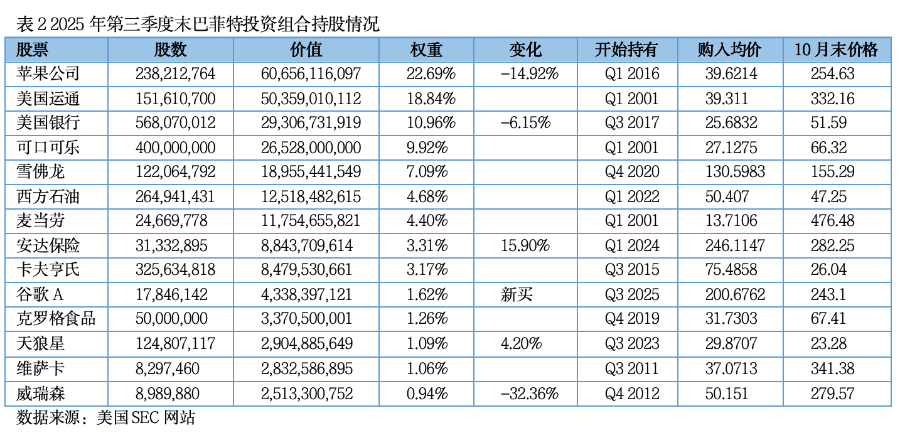 三季度巴菲特的投资策略有何启示?金融市场调整阶段的敏感时期,巴菲特投资组合或许能给投资者带来一些启示:耐心投资和稳健操作。第三季度末,巴菲特投资组合价值2672亿美元,持有42家公司股票。表2列出了巴菲特投资组合中权重最大的14只股票,其市值占了组合的91.03%。首先,在第三季度里,巴菲特组合减持了苹果、美国银行、威瑞森、达维塔、纽柯钢铁、霍顿房屋(清空);增持了安达保险、天狼星(SIRI,通信)、达美乐披萨、莱纳地产、拉马尔户外广告;新买入谷歌A股。