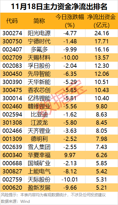 据数据宝统计,近200股主力资金净流出均超1亿元,其中20股净流出金额均超5亿元,资金流出规模不容小觑。9股遭到主力资金大幅净流出均超10亿元,其中阳光电源主力资金净流出24.16亿元,居首;多只热门股股价回调,宁德时代、多氟多和天赐材料主力资金净流出均超13亿元,其中多氟多和天赐材料股价均跌停,热门股波动较大。