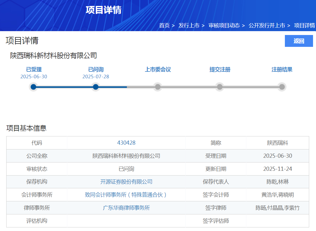资料显示,陕西瑞科成立于2003年,主要从事贵金属催化剂的研发、生产等业务。公司股票自2022年6月15日起调入创新层,后转道北交所上市辅导。