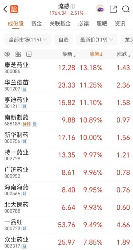 周二(11月25日)A股抗流感概念大涨,康芝药业、华兰疫苗、亨迪药业等多股涨超10%,新华制药、特一药业、广济药业等多股涨停。