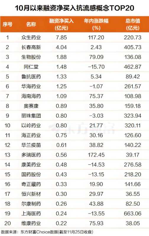 东方财富Choice数据显示,今年10月以来,杠杆资金抢筹多只抗流感概念股,其中众生药业排名第一,融资净买入接近8亿元;长春高新排名第二,融资净买入超4亿元。