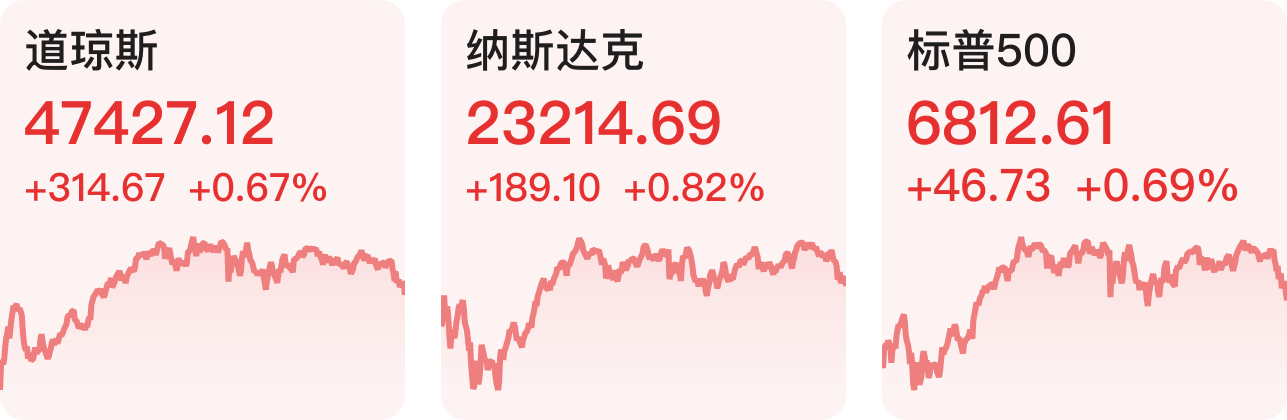 当地时间11月26日,美股三大指数集体收涨,道指涨0.67%,标普500指数涨0.69%,纳指涨0.82%。大型科技股多数上涨,甲骨文涨超4%,博通、AMD涨超3%,英伟达、特斯拉、微软涨超1%。纳斯达克中国金龙指数收跌0.03%,热门中概股涨跌不一,爱奇艺跌超3%,哔哩哔哩、小鹏汽车跌超2%;拼多多、名创优品涨超1%,京东、阿里巴巴、理想汽车小幅上涨。