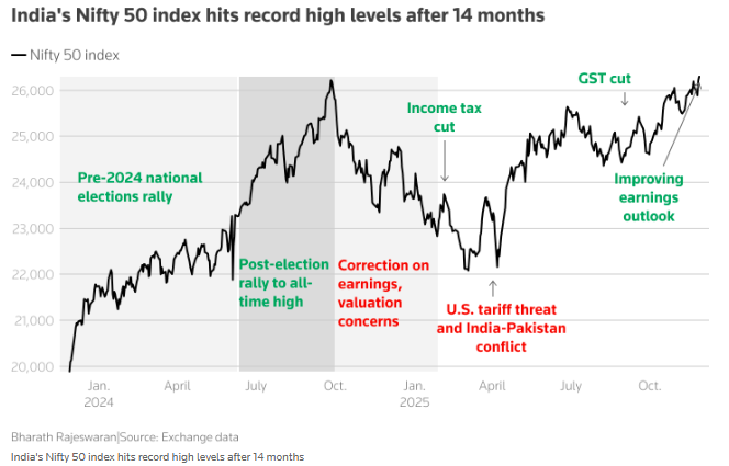 印度市场上的两大基准指数——Nifty 50指数和孟买敏感指数(BSE Sensex),周四双双时隔约14个月再度刷新了历史最高位。分析人士表示,这主要受到了盈利复苏预期、前期市场估值回落以及财政货币政策支撑下的经济韧性推动……