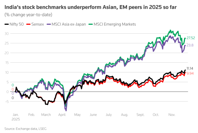 杰富瑞分析师Mahesh Nandurkar领导的团队表示,“过去12个月印度基准指数相较亚洲及新兴市场同类指数的显著落后表现,可能促使资金重新流入印度股市;而潜在的美印贸易协议,也可能成为推动资金流入股市的积极催化剂。”
