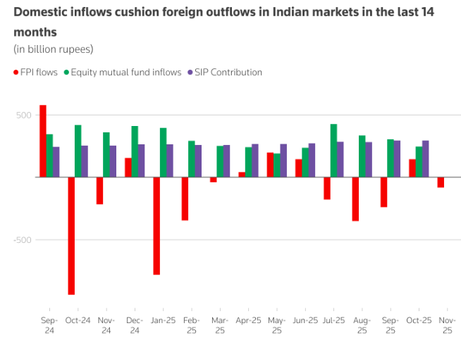 数据显示,过去14个月,股票型共同基金已购入价值2.92万亿卢比(329.4亿美元)的印度股票,超过同期169亿美元的外国资金流出规模。