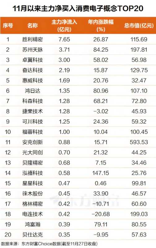 东方财富Choice数据显示,自11月以来,主力资金抢筹多只消费电子概念股,其中胜利精密排名第一,主力净买入7.7亿元;苏州天脉排名第二,主力净买入3.7亿元。