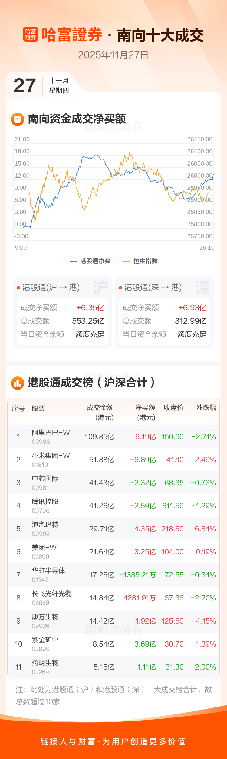 11月27日,恒生指数微涨0.07%,南向资金净流入港股,成交活跃。关注主要成交个股的买卖情况。