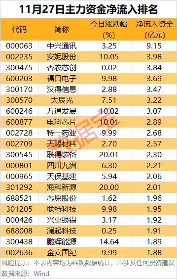 据证券时报·数据宝统计,从个股来看,50股获主力资金净流入超1亿元,14股获主力资金净流入超2亿元。