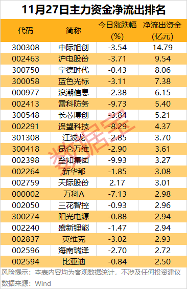 今日有33股主力资金净流出均超2亿元,其中,中际旭创、沪电股份、宁德时代、蓝色光标、浪潮信息、雷科防务、长芯博创净流出金额均超5亿元。