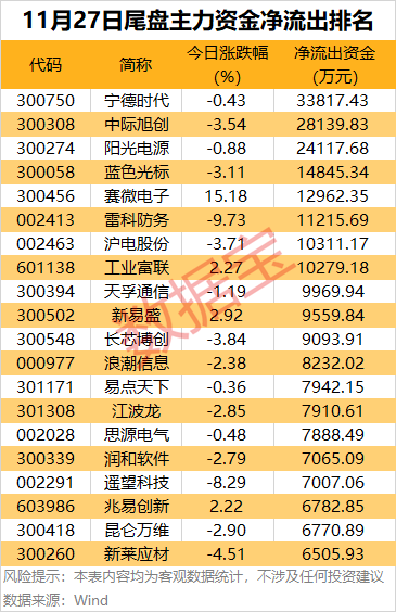 尾盘主力资金净流出方面,宁德时代、中际旭创、阳光电源尾盘主力资金净流出均超2亿元;蓝色光标、赛微电子、雷科防务、沪电股份、工业富联尾盘主力资金净流出均超1亿元。