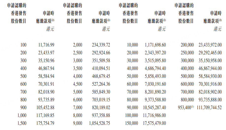 申购信息如下:每手100股,入场费为11716.99港元。乙组投资者的门槛为5万股,申购所需资金约为585.85万港元。