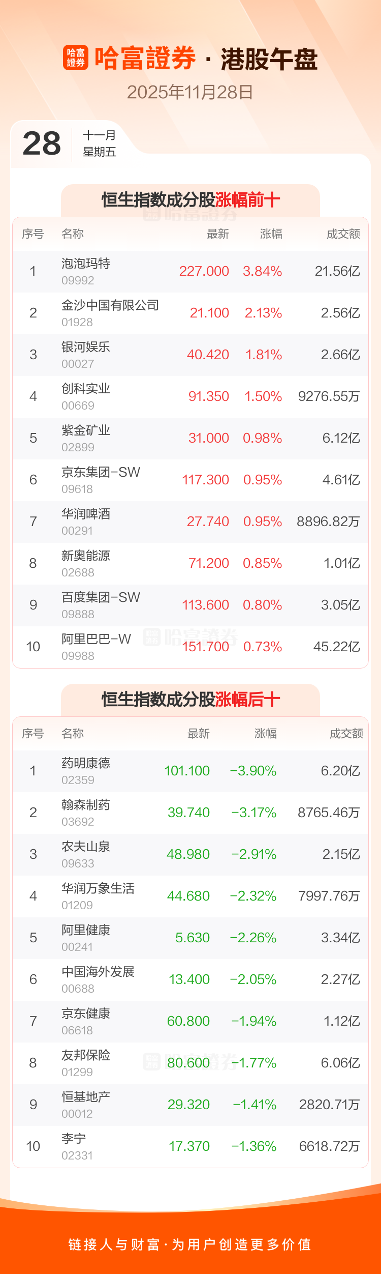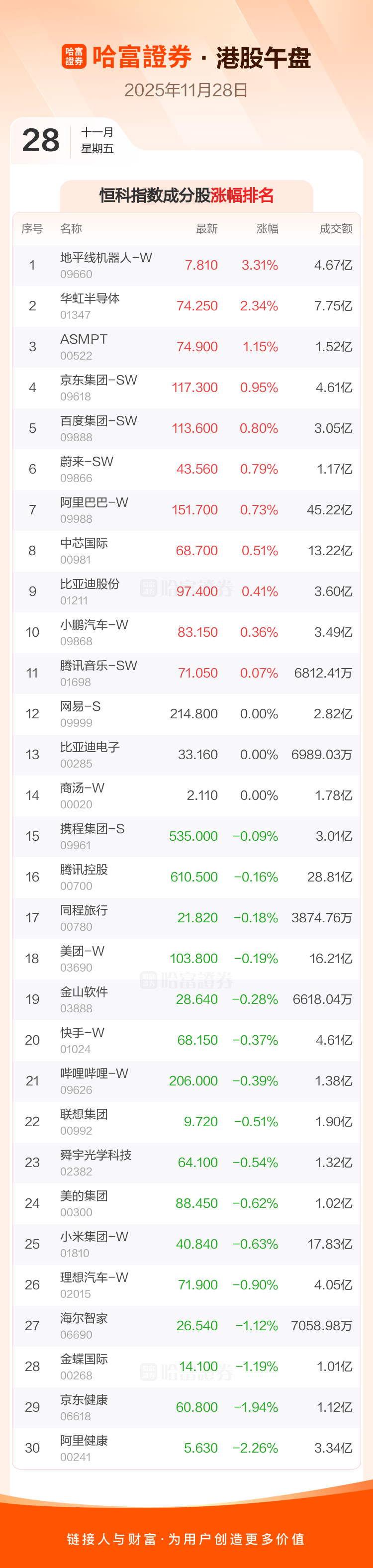 港股11月28日午盘走低,恒生指数收报25884.42点,跌61.51点,跌幅0.24%;恒生科技指数收报5603.88点,涨5.83点,涨幅0.1%。恒生指数成分股中泡泡玛特、金沙中国有限公司、银河娱乐涨幅居前,药明康德、翰森制药、农夫山泉跌幅靠前。恒生科技指数成分股中地平线机器人-W、华虹半导体、ASMPT涨幅居前,阿里健康、京东健康、金蝶国际跌幅靠前。