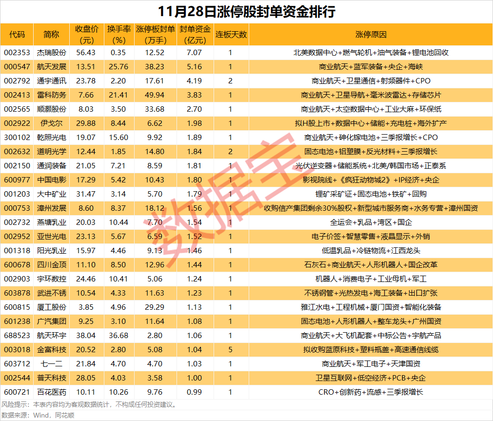 以封单金额计算,24股封单资金均超1亿元,杰瑞股份、航天发展、通宇通讯封单资金居前,分别为7.07亿元、5.16亿元、4.19亿元。