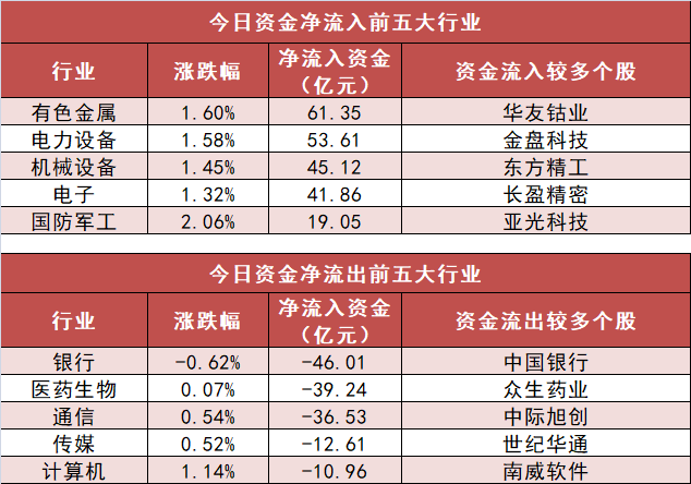 申万一级行业中,22个行业实现资金净流入,其中有色金属行业净流入61.35亿元居首。