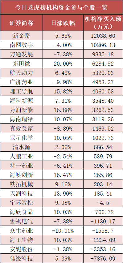 盘后龙虎榜数据显示,机构现身多股,其中新金路等股票呈现机构资金净买入,佳缘科技等股票呈现机构资金净卖出。