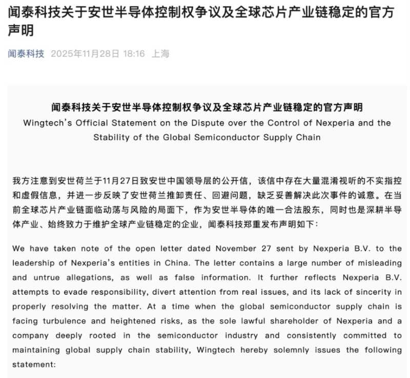 闻泰科技发布声明称安世半导体控制权争议是导致全球芯片供应链混乱的根源。声明中呼吁安世荷兰正视问题并共同守护产业链稳定。