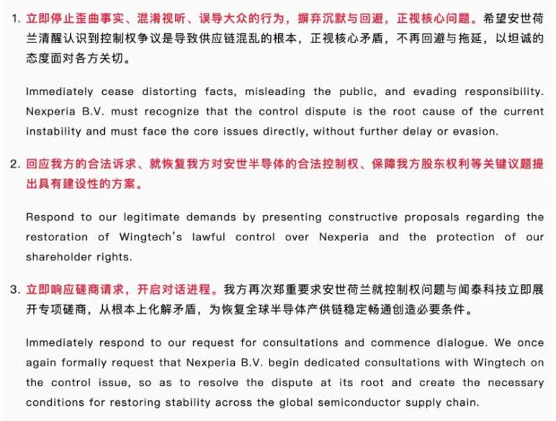 3.立即响应磋商请求,开启对话进程。我方再次郑重要求安世荷兰就控制权问题与闻泰科技立即展开专项磋商,从根本上化解矛盾,为恢复全球半导体产供链稳定畅通创造必要条件。