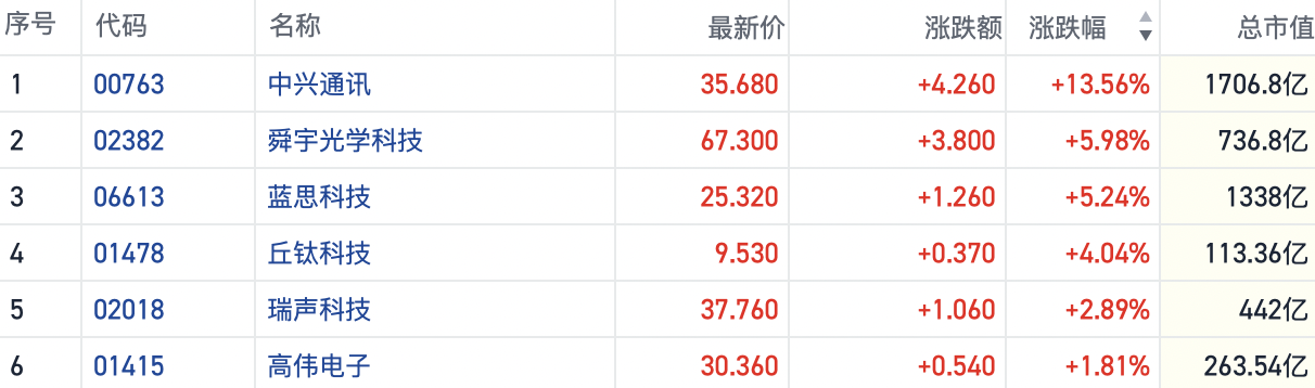 截至发稿,中兴通讯(00763.HK)受益与字节合作利好催化大涨超13%,蓝思科技(06613.HK)涨超5%,瑞声科技(02018.HK)等产业链公司也纷纷跟涨。