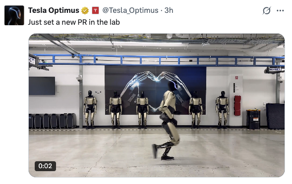 北京时间12月3日,特斯拉CEO马斯克在社交平台X转发特斯拉擎天柱(Optimus)团队发布一段“擎天柱”人形机器人跑步的短视频。该团队配文称:刚在实验室刷新了个人纪录(PR,Personal Record)。