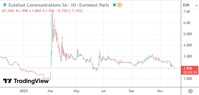 今年3月初,在美国宣称削减对乌克兰军事援助的背景下,欧洲急于加强自身科技主权,Eutelsat股价一度飙涨逾600%。但其后股价已回落逾70%。