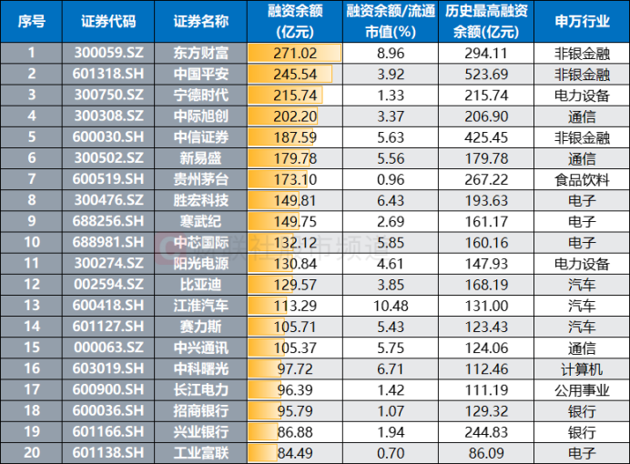 目前,市场整体融资余额规模仍在继续上升,截至12月2日数据,其近6个交易日均实现净买入,合计获融资客加仓266亿元。具体重仓股方面,当下共有15股融资余额在100亿元以上,其中,东方财富、中国平安、宁德时代、中际旭创、中信证券融资余额位列前五,此次7连涨的新易盛位居第六位,贵州茅台、胜宏科技、寒武纪、中芯国际等股紧随其后。