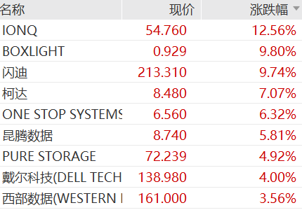 美股计算机硬件、芯片股涨幅明显,闪迪涨近10%,Hut8涨近7%,戴尔科技涨4%,惠普涨近3%。消息面上,今年四季度以来,存储行业迎来史诗级涨价浪潮,其中闪迪与11月初大幅上调NAND闪存合约价约50%,是本轮NAND涨幅最大的单次调价。