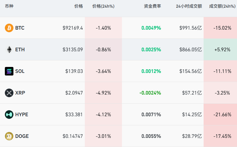 加密货币集体下挫,成交额普跌,比特币一度向下跌破91000美元,截至北京时间12月5日6:24,过去24小时内下跌1.4%,成交额跌15%。全市场超10万人被爆仓,爆仓总金额近3.2亿美元。
