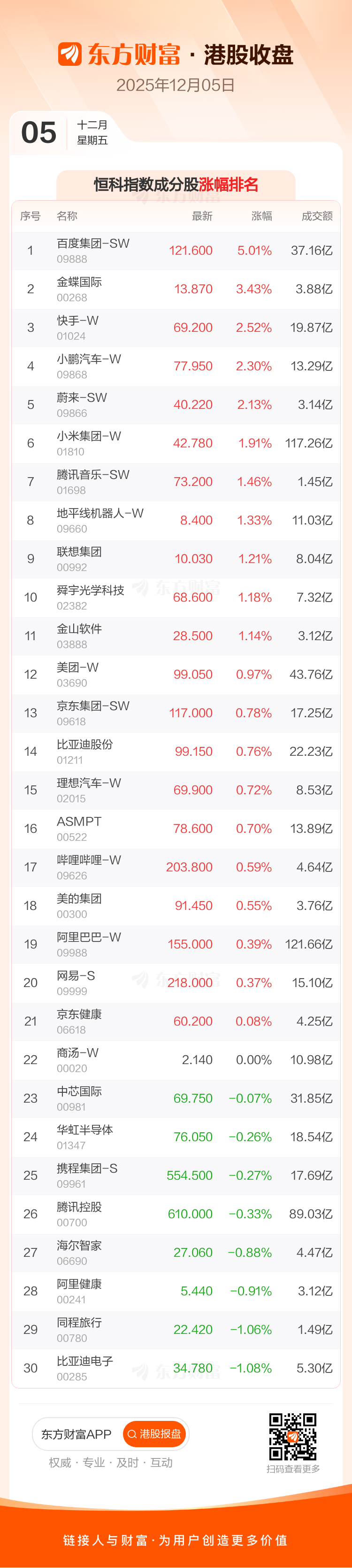 港股12月5日收盘走高,恒生指数及恒生科技指数均上涨。其中,百度集团-SW等科技股涨幅居前。